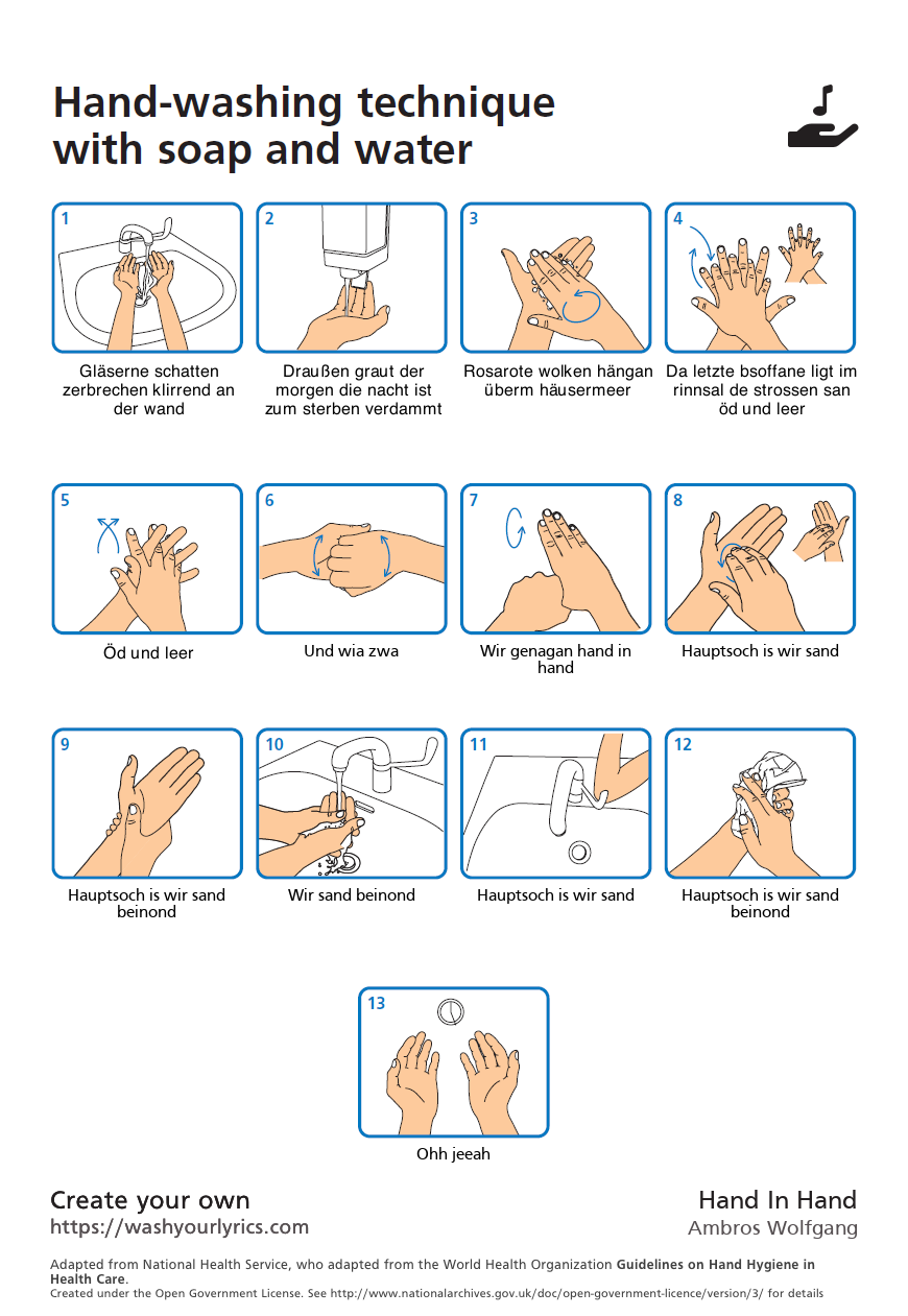 Wir alle wissen ja, dass Händewaschen ganz allgemein und zur Zeit besonders wichtig ist. Und weil mit Musik sowieso alles besser geht, gibt es hier eine Anleitung, wie Ihr zu Wolfgangs Nummer "Hand in Hand" (ganz passend) Händewaschen könnt.